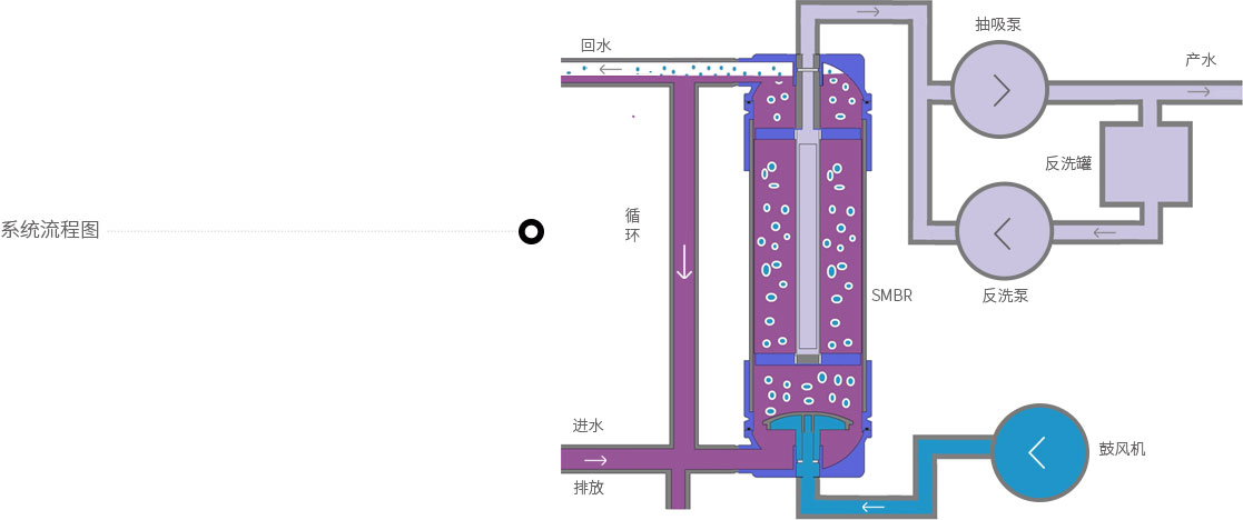 SMBR 是一種浸沒(méi)式,真正可反洗卷式膜,適用于工業(yè)廢水和工藝用水。SMBR 是在傳統(tǒng)卷式膜的基礎(chǔ)上增加曝氣擦洗,從透過(guò)液側(cè)提供壓力和流量進(jìn)行反洗的創(chuàng)新性產(chǎn)品。它的最大優(yōu)勢(shì)在于無(wú)需在供給側(cè)提供高耗能的壓力和流量,而僅在透過(guò)液側(cè)按相應(yīng)產(chǎn)能提供抽吸能量。同時(shí),它可與中空纖維膜按同樣的反洗頻次進(jìn)行反洗。